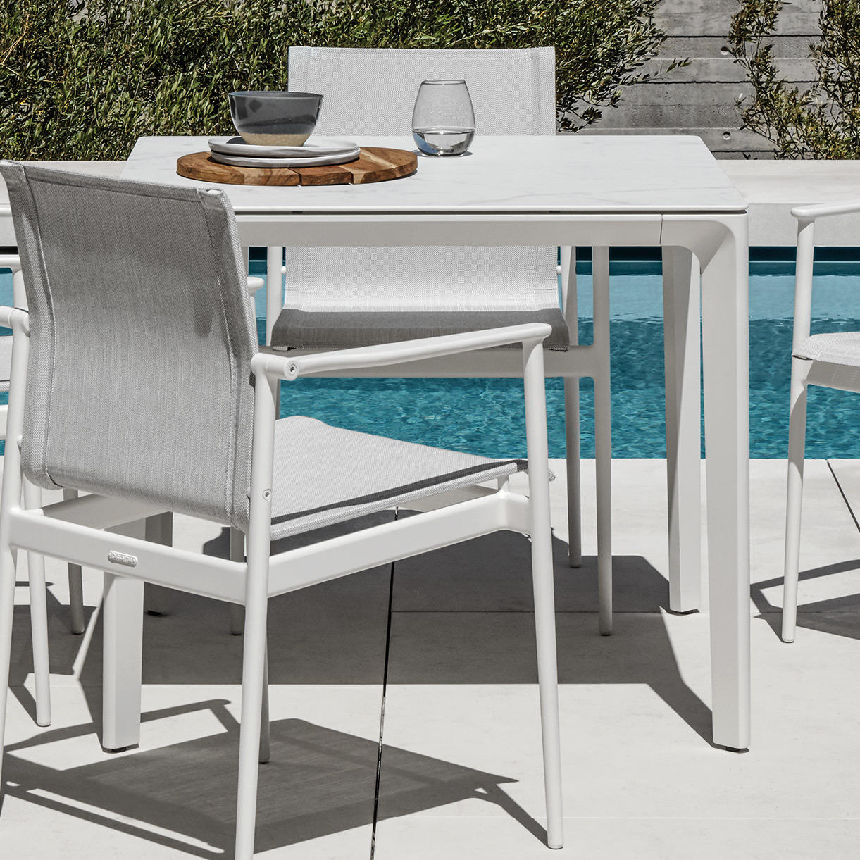 The Carver square table has a slim frame and is made from powder-coated aluminium.