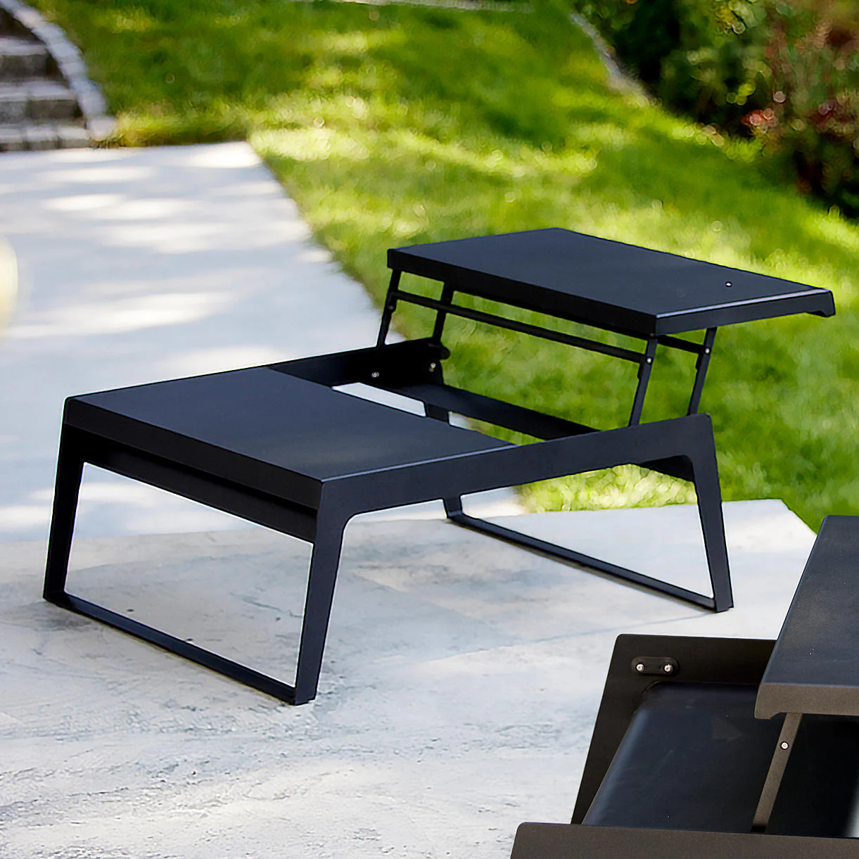 The dual height coffee table allows the top of the table to be lifted up, allowing top to the the correct height to eat at when seated on the modular lounge furniture. Also in UV resistant powder-coated aluminium making it ideal for alfresco entertaining.