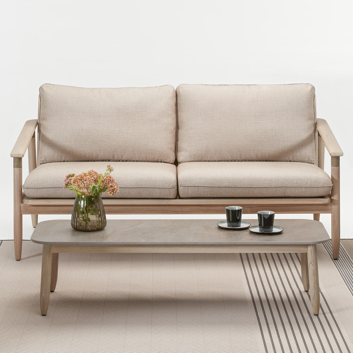 The David lounge sofa in aged teak with woven back and rope details is perfect for adding a refined look to its surroundings.