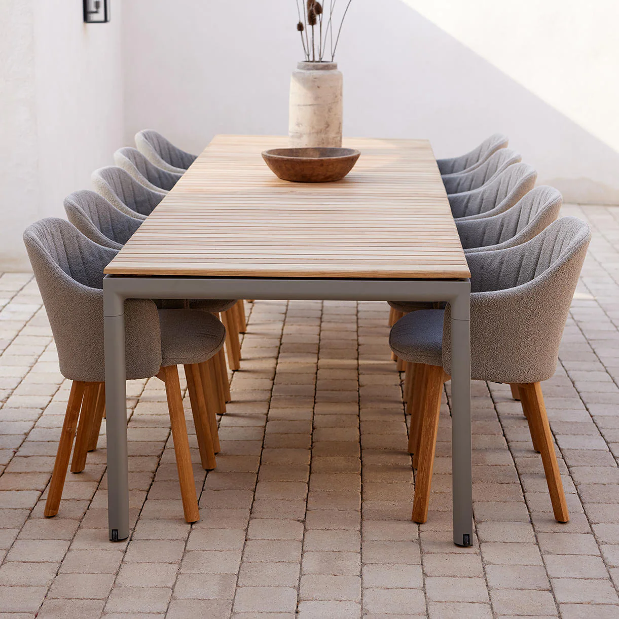 The Drop dining table combines an urban styled teak table top, balanced with a softer shaped aluminium frame. The Drop collection is inspired by a drop shape that gives a profile with both sleek edges and soft curves.