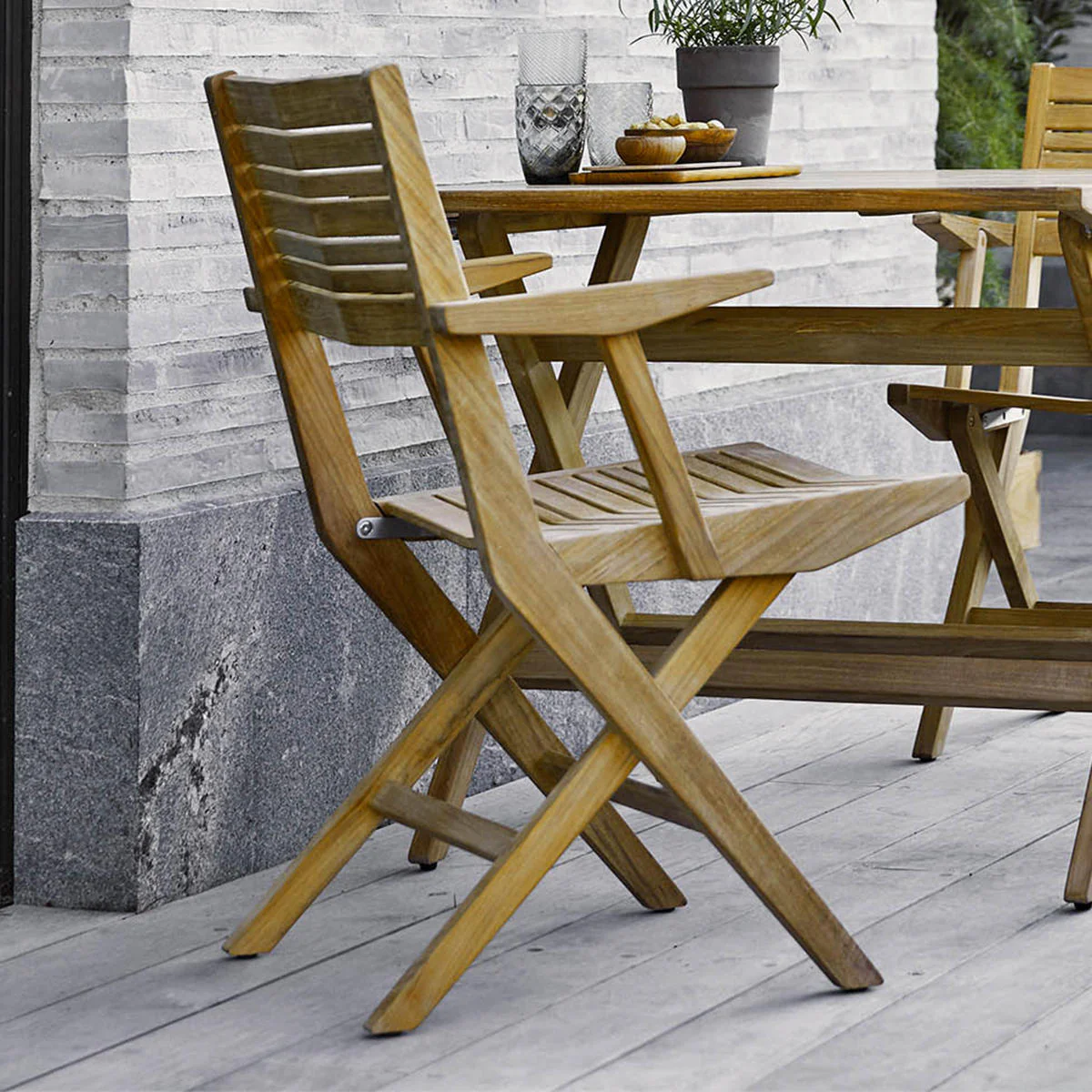The warm teak adds an inviting glow to the simple and elegant folding chairs.
