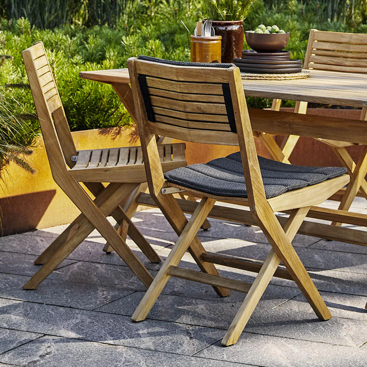 The warm teak adds an inviting glow to the simple and elegant folding chairs.