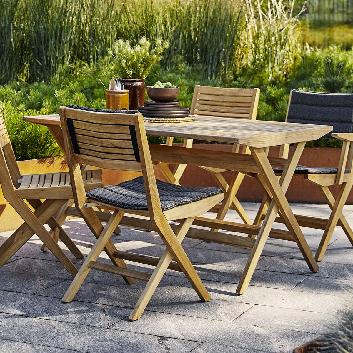 The warm teak adds an inviting glow to the simple and elegant folding tables.