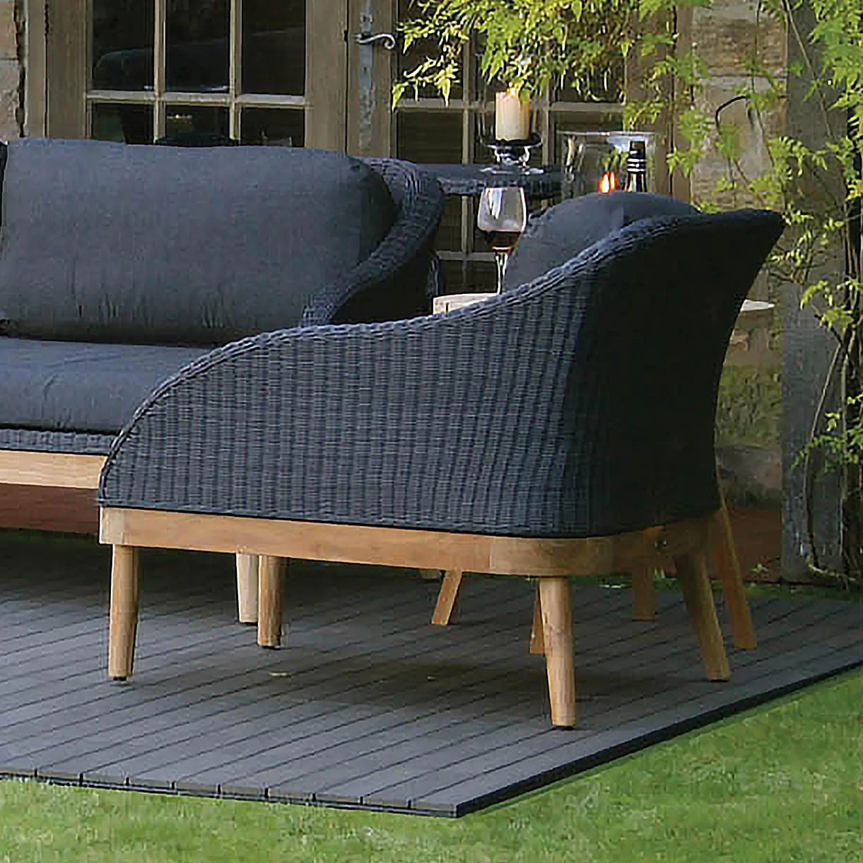 The lounge chairs are made with an outdoor synthetic weave with detailing of the natural teak legs.