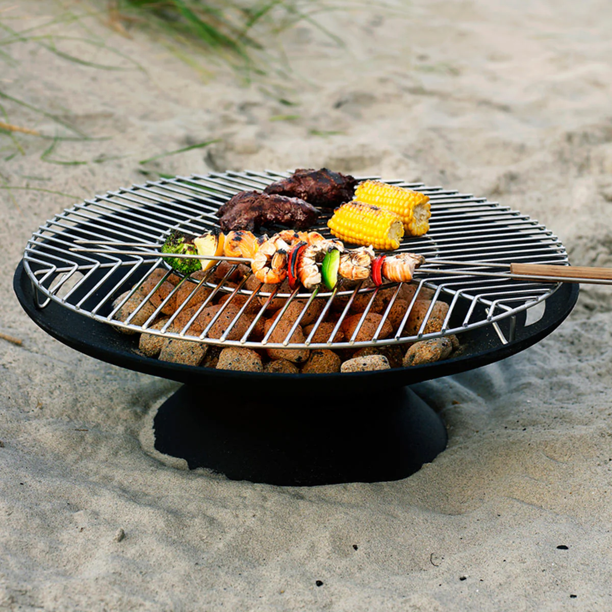 Helios Steel Grill for Cast Iron Fire bowl by Skagerak the perfect way to keep the cold away on chilly summer evenings.