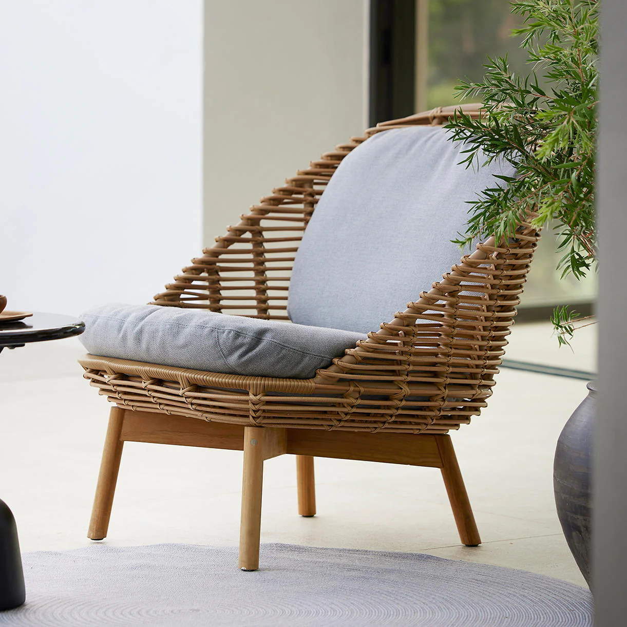 Hive lounge chair has a sturdy teak base, which lends a warm touch to the design, while the laid-back shell is woven in Cane-line Weave® in an open wicker pattern.