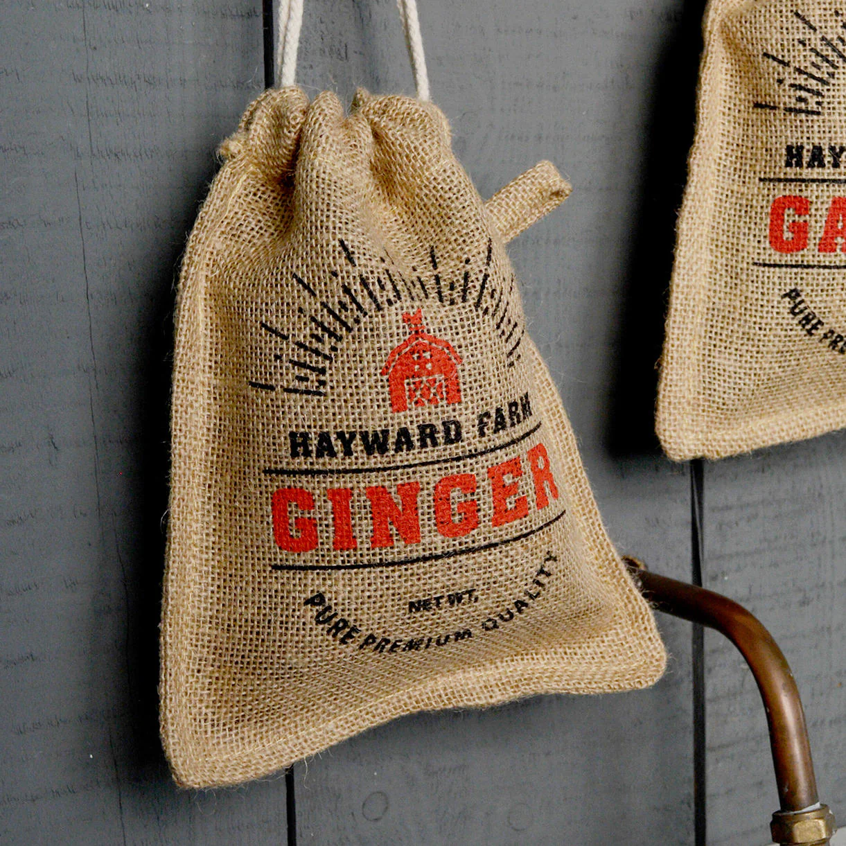 Really handy drawstring jute bags with a black cotton liner to keep your ginger roots fresh and dry.