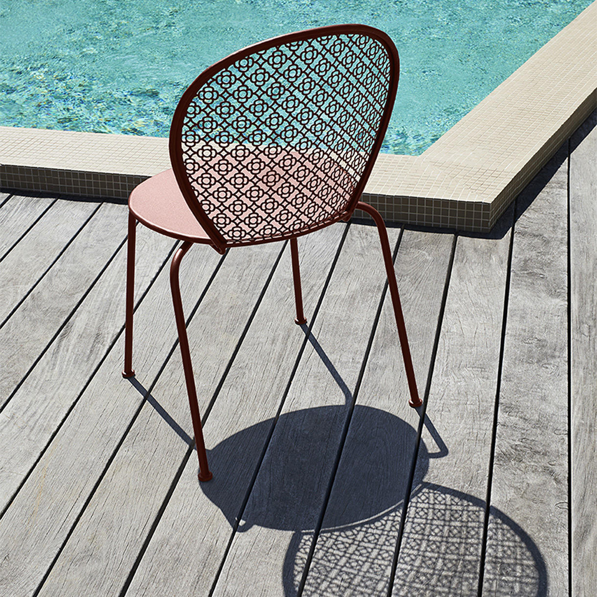 Classic oval backed metal garden chairs designed by Frederic Sofia for Fermob. With a nod to the classic chair designs of the 1950's, with slender, straight legs and rounded angles.