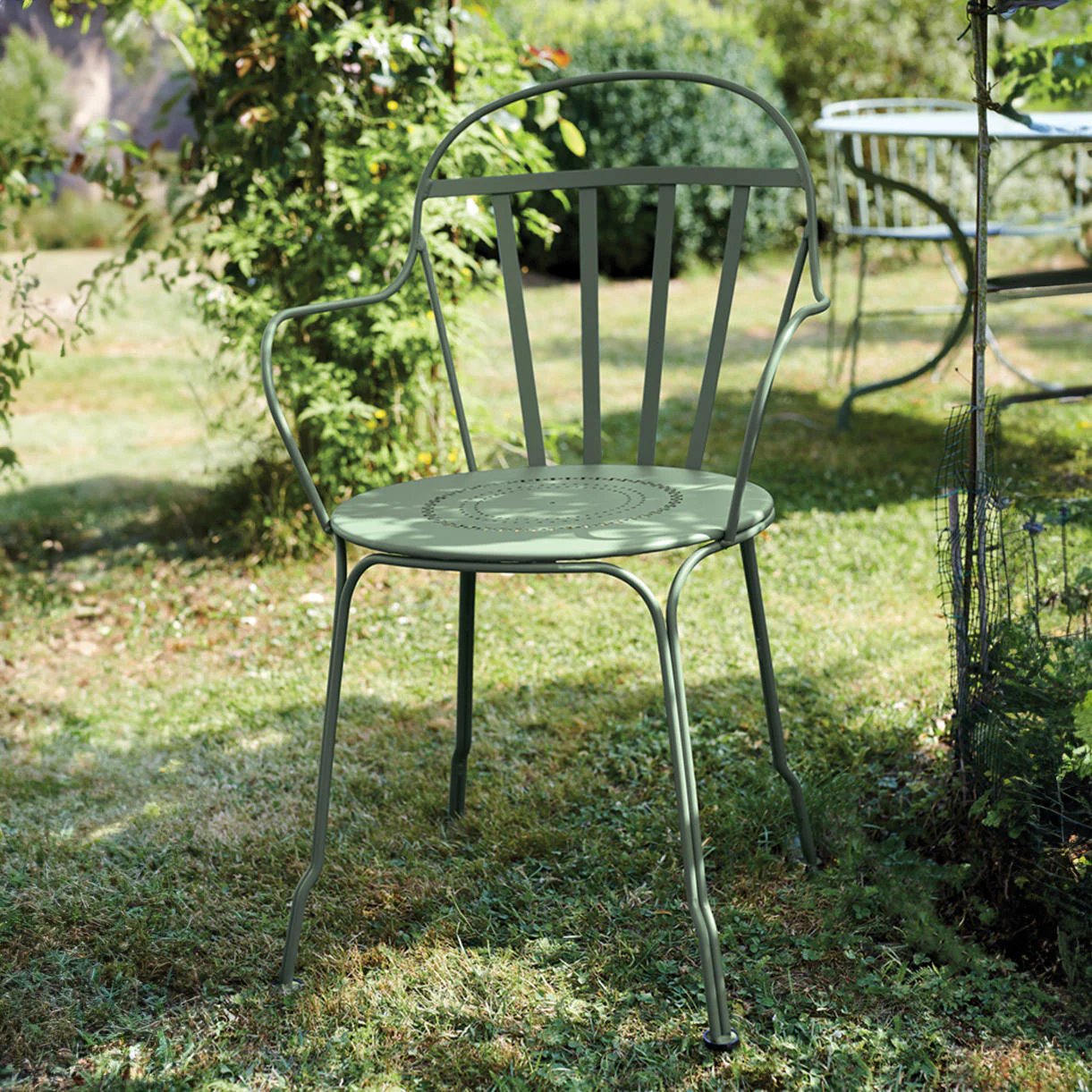 Metal garden armchairs in traditional French style that can be stacked for easy storage.