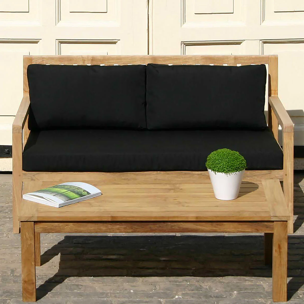 The beautiful deep, plantation teak sofas have optional upholstery that make them irresistibly comfortable.