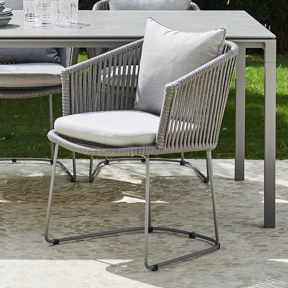 The chairs are produced using Cane-line all weather Soft Rope, over a grey powder coated aluminium frame.