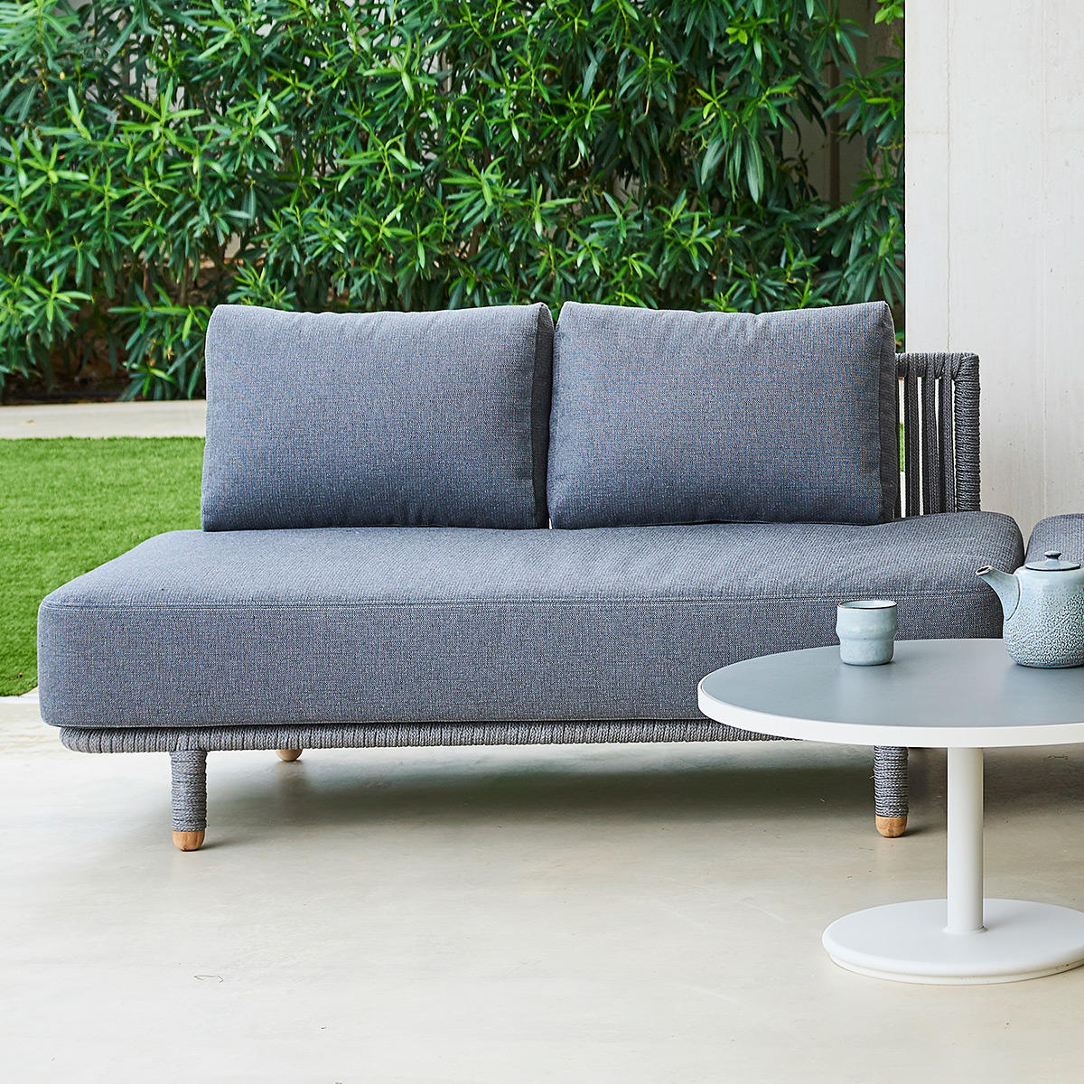 Produced using Cane-line all weather Soft Rope and all weather SoftTouch or AirTouch QuickDry fabric cushions, over a powder coated aluminium frame with teak detailing.