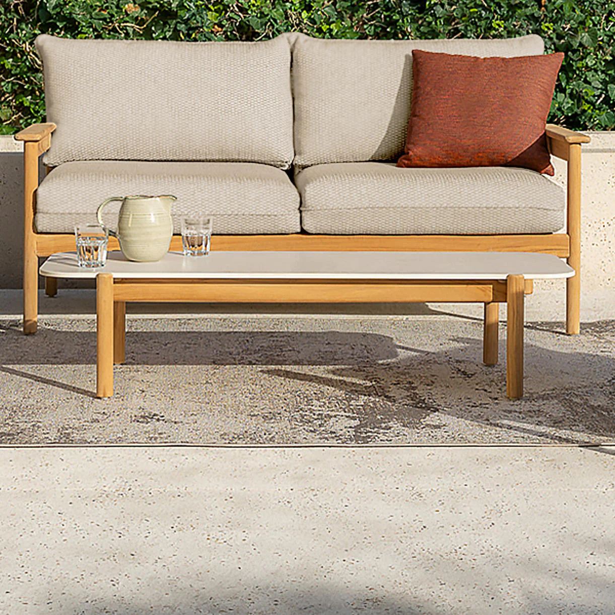 Embrace the seamless fusion of teak and ceramic, introducing a rectangular coffee table that enhances both the functionality and aesthetic charm of your outdoor space.