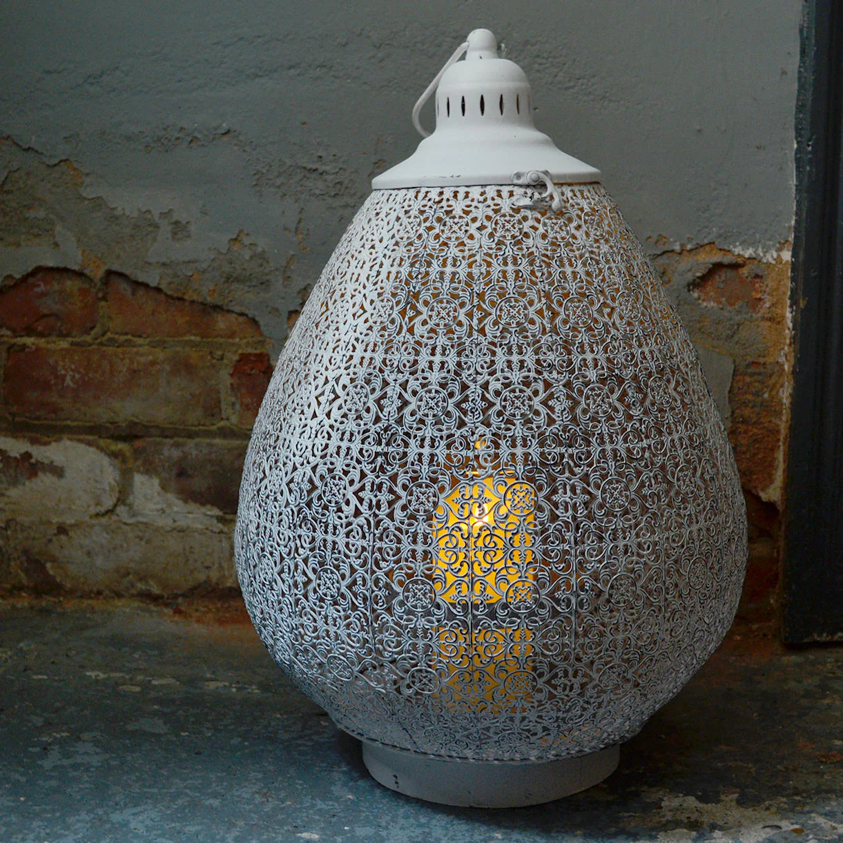 In a heritage white-wash paint finish, the Amberley oval filigree lantern is a striking lantern for a conservatory or garden room.