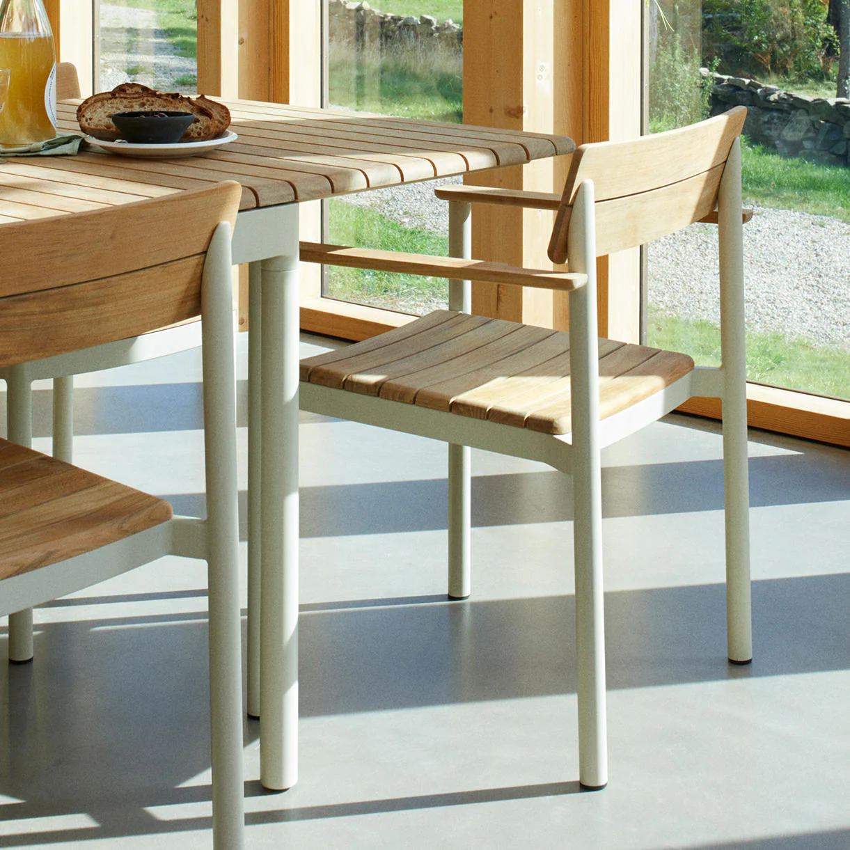 High on comfort for long dinners, the armchair has wide wooden armrests that form part of the structure, while still being slender enough to group around a table.