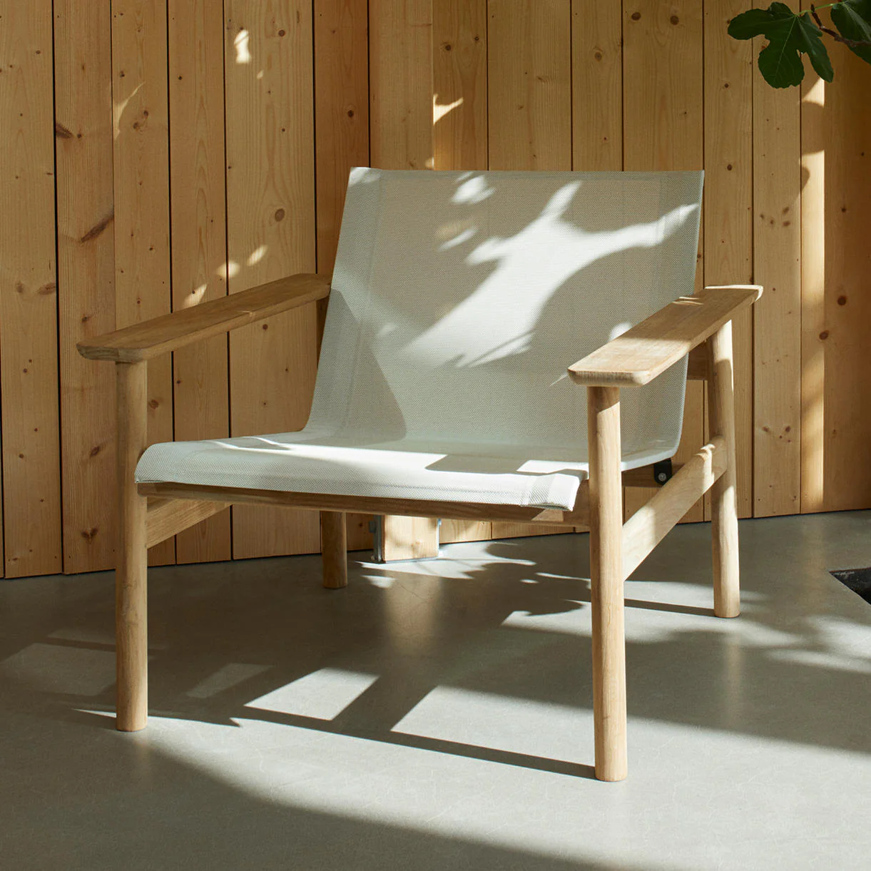 The lounge chair has a solid teak frame that evokes a classic Scandinavian typology with a weatherproof Sling fabric seat which brings a modern edge with its lightness and transparency.