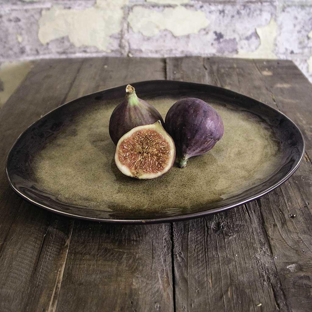 In rich olive green and rich fig coloured glazes with the shape based on natural lines of an olive.