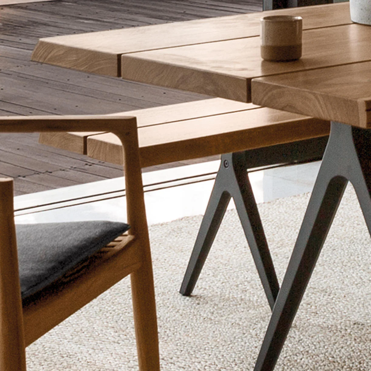 The large Raw benches are made from a powder-coated aluminium frame to give the feeling of air and light, with a large raw teak panel seat.