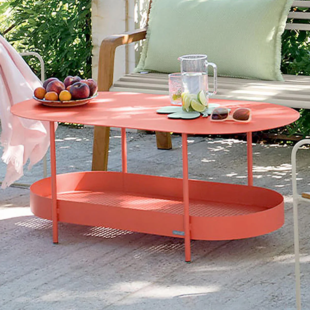 This unusual occasional table has a oval design and an asymmetrical look, and is an elegant companion to your patio furniture, it can be used as a low table, and practical to be used outside as it has drainage holes in the bottom shelf.