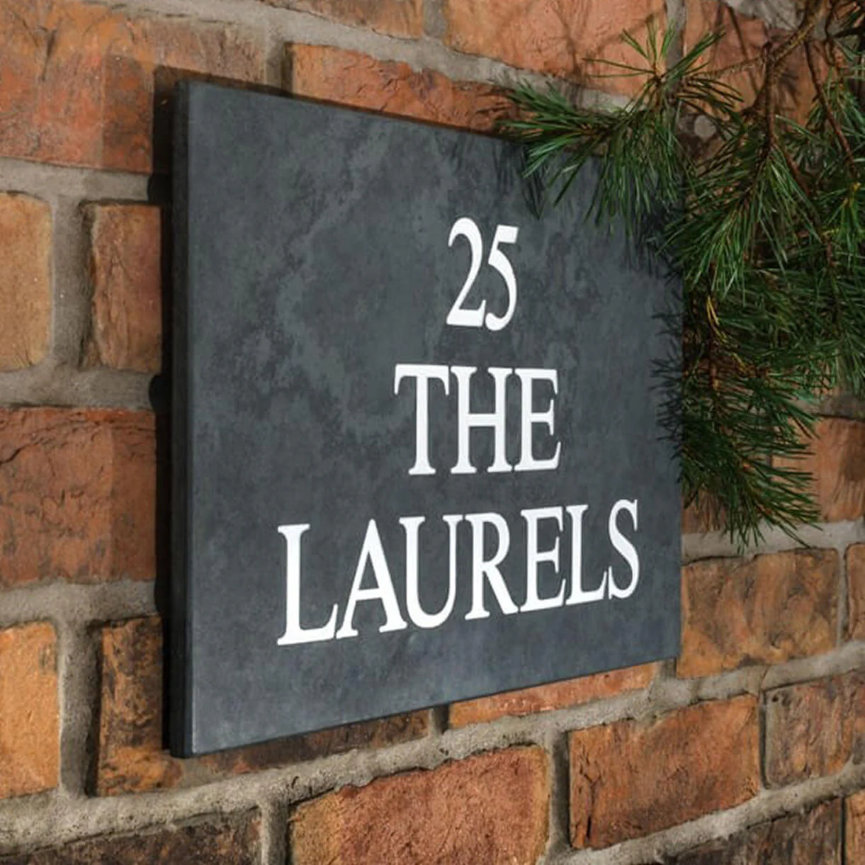 Your chosen house name will be sandblasted on the slate in Times Roman font and then hand painted white.