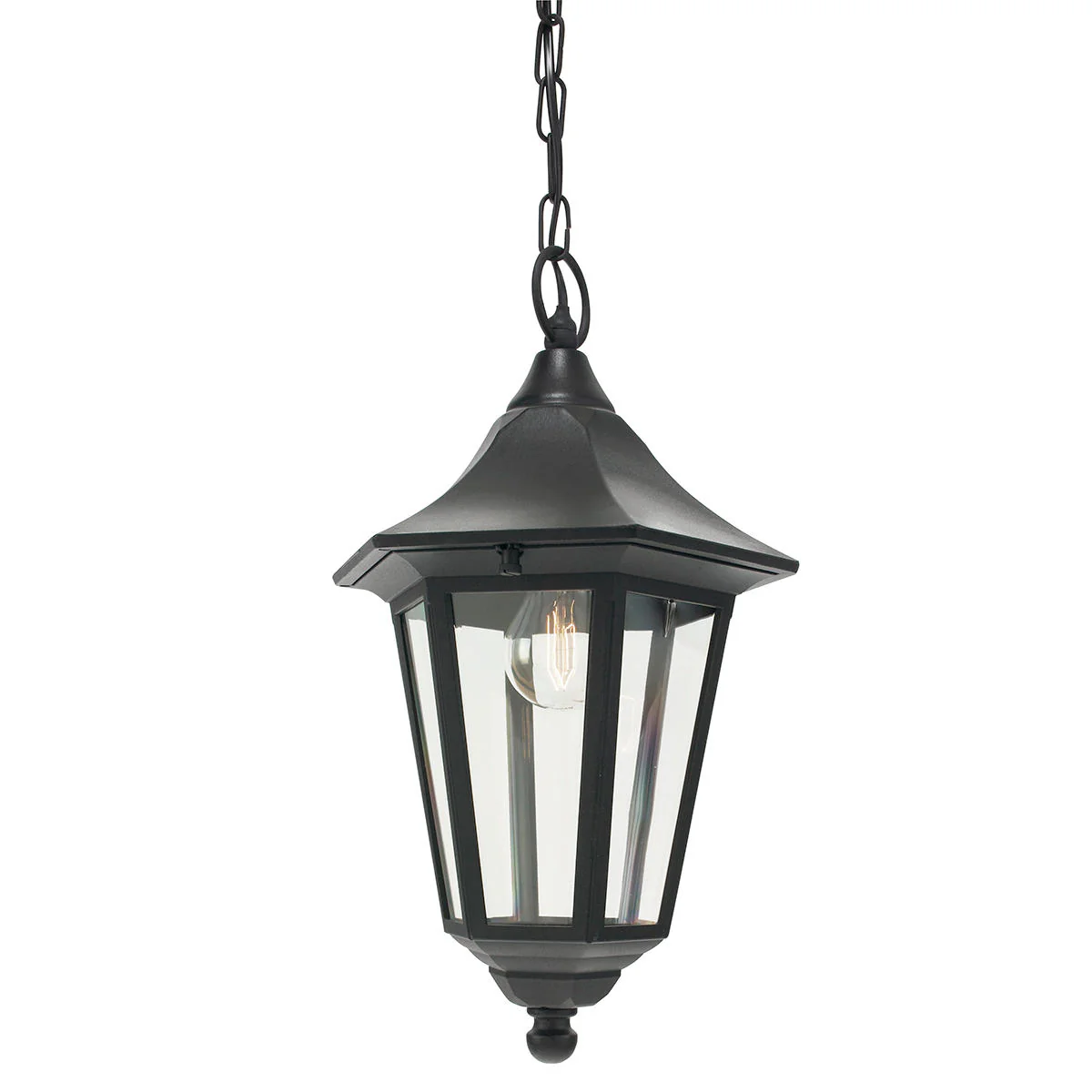 Part of the Valencia collection of lights, this die-cast aluminium hanging lantern has a black powder-coated finish and has a lightly tinted polycarbonate lens.