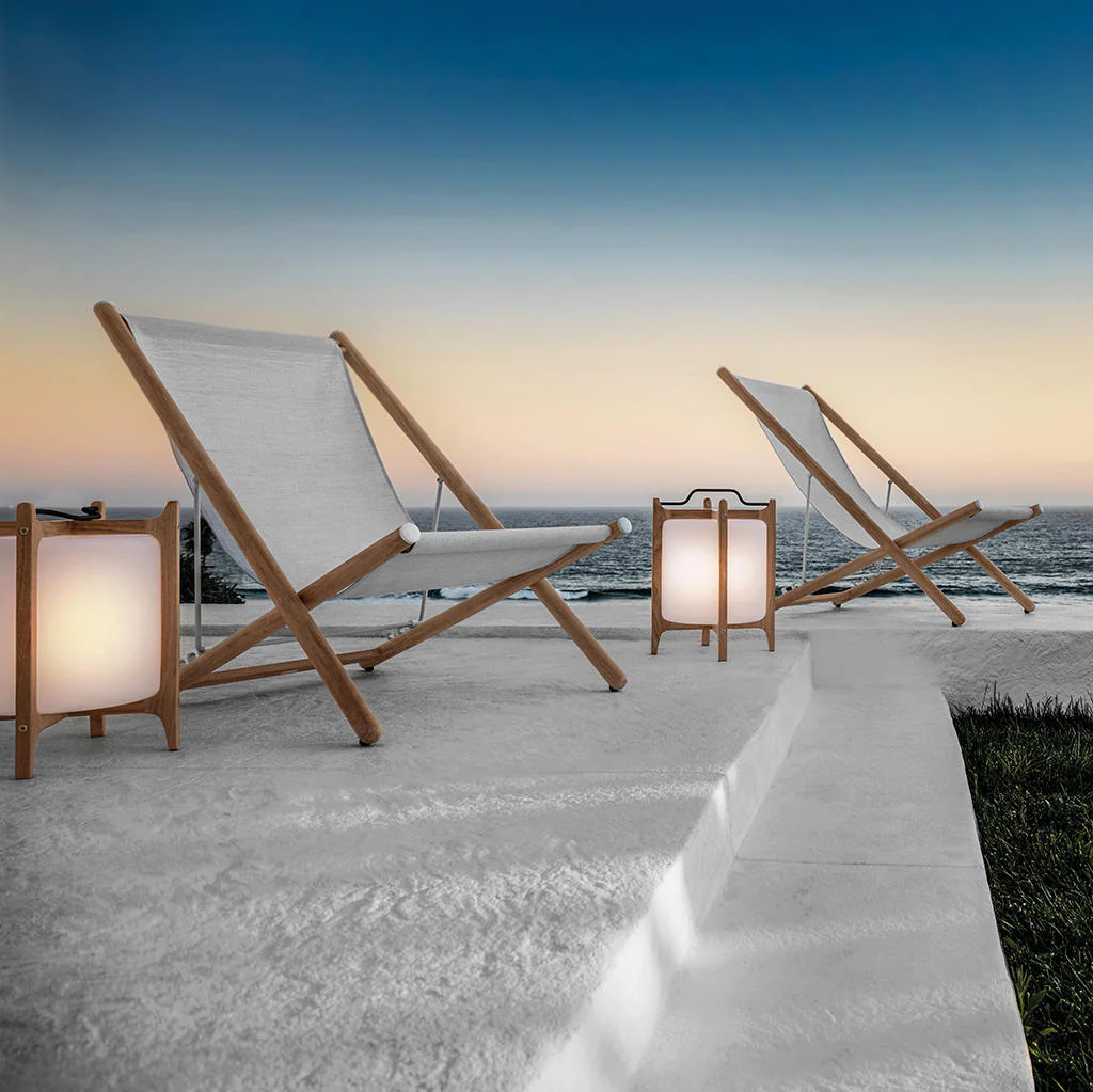 The Voyager collection by Gloster evokes a contemporary look with vintage style. The deck chairs are shown here with Voyager LED Outdoor Lanterns.