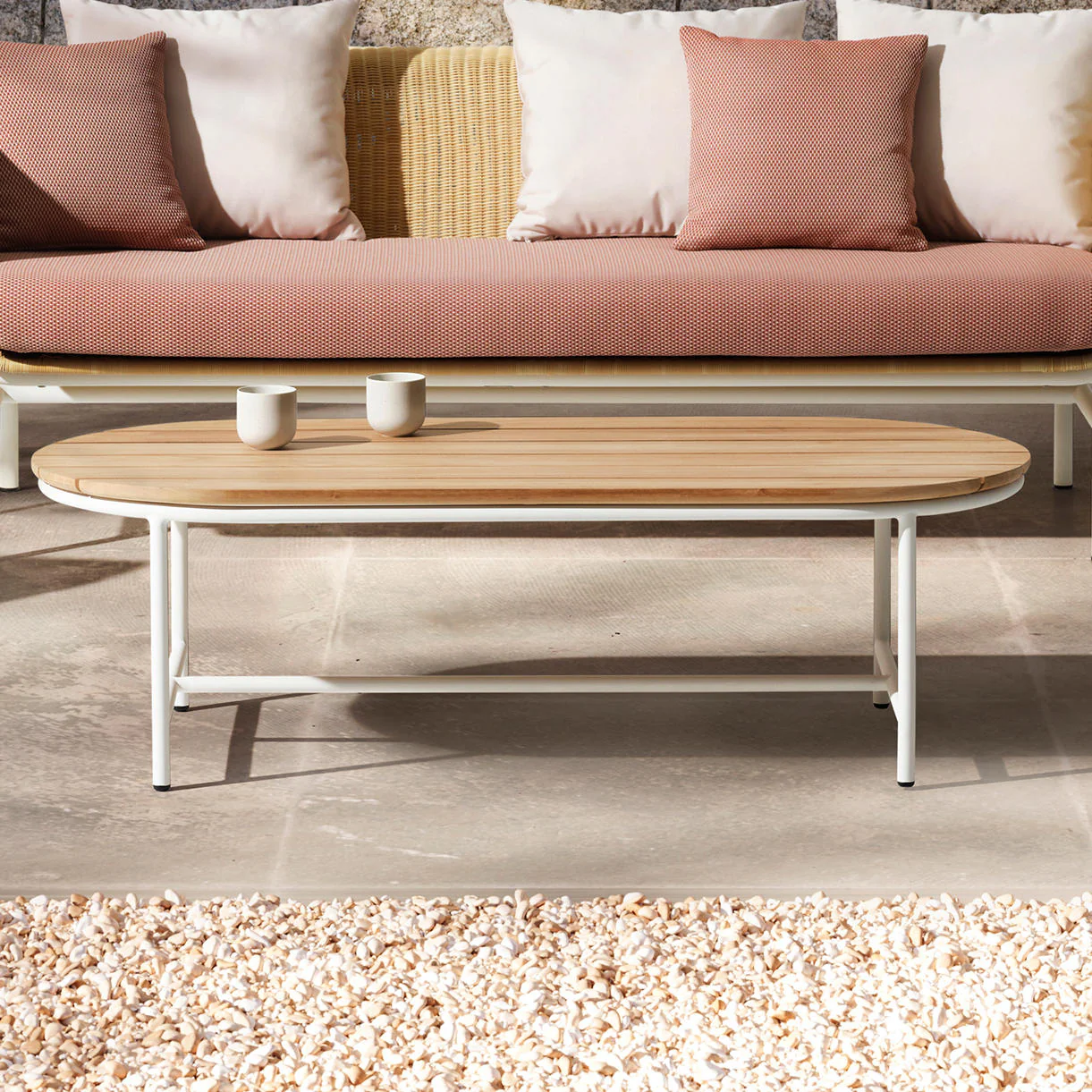 The frame is is made from powder-coated aluminium in Black or White with a fine sanded teak table top.